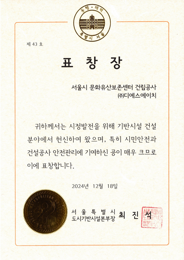 서울시 문화유산보존센터 건립공사 표창장 수상 페이지 정보 작성자 최고관리자 댓글 0건 조회 1,513회 작성일 25-04-16 17:26 목록 답변 본문 서울시 문화유산보존센터 건립공사 표창장 수상 이전글삼성 E&A 안전인정제 취득 25.04.23 다음글2024년 GC녹십자EM Best Partner 수상 24.12.04 댓글 0 댓글목록 등록된 댓글이 없습니다.